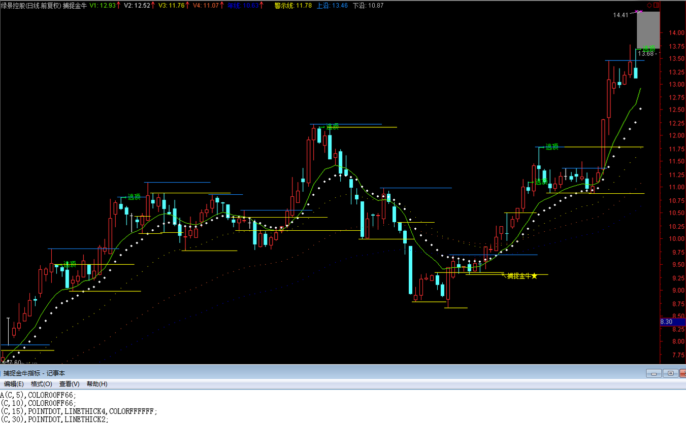使用方法主圖指標(biāo)出現(xiàn)捕捉金牛 就要加入自選。 出現(xiàn)捕捉金牛是必勝戰(zhàn)法里面的票 ,做這些票 安全 賺錢 所以稱為必勝