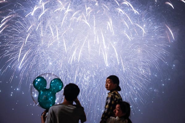 2016年6月16日,游客在樂園外一座跨越停車場和小鎮(zhèn)的高架橋上觀賞盛大的開幕日煙火表演。 澎湃新聞記者劉行喆圖