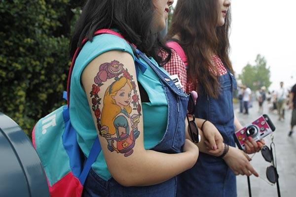 一名游客把印有迪士尼卡通形象的貼紙貼在胳膊上。