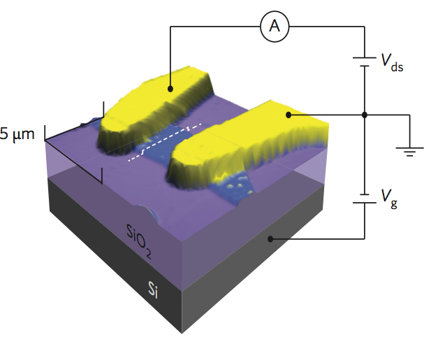 黑磷二維晶體場效應(yīng)管結(jié)構(gòu)圖。圖片來源:Yuanbo Zhang et al. (2014) Nature Nanotechnology.
