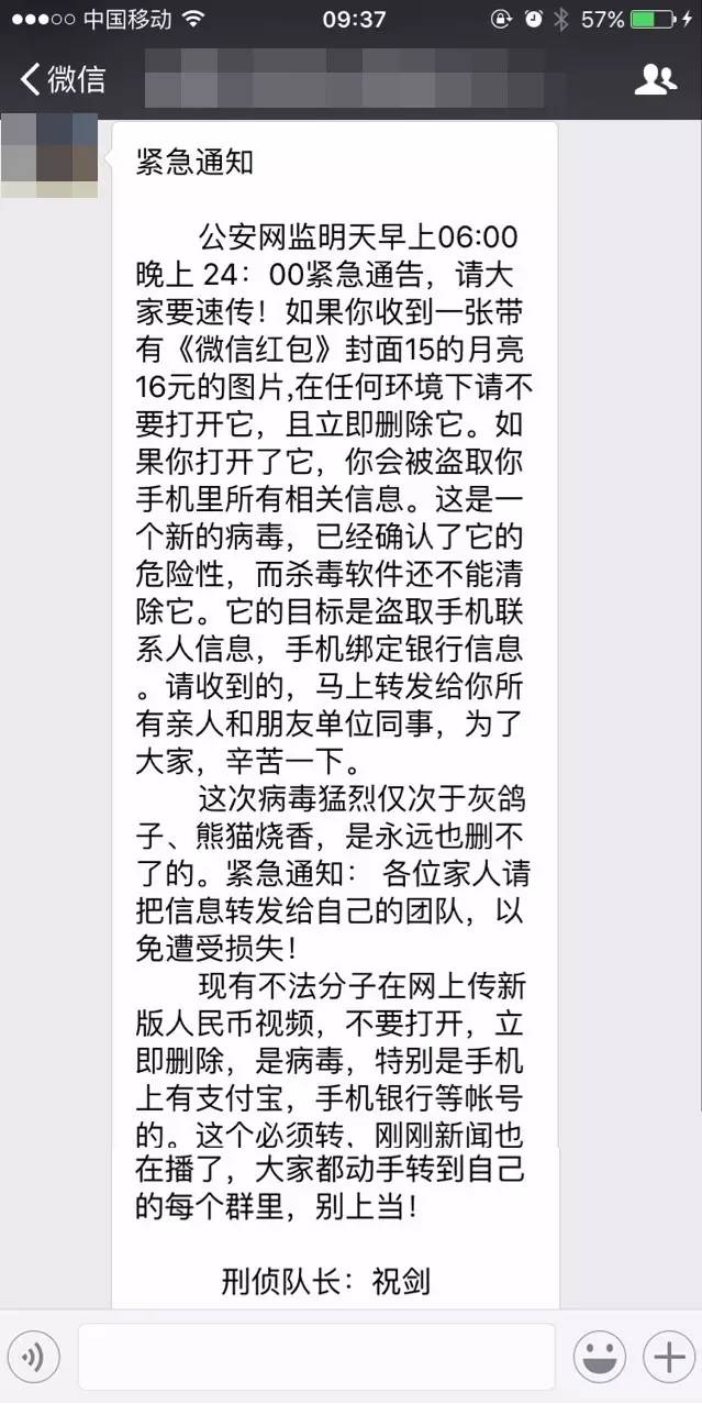 手機(jī)落入執(zhí)法部門手中,這對遵紀(jì)守法的普通人來說畢竟是一件小概率事件,人們更加恐懼的是那種中秋前夕在各個微信群中被不斷轉(zhuǎn)發(fā)的令人嚇破膽的“紅包有毒,病毒入侵手機(jī)盜取銀行信息”(已經(jīng)被官方證明是謠言)。