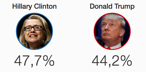 之前二人民調(diào)結(jié)果還處于五五分的現(xiàn)狀,雖然希拉里先為領(lǐng)先,但領(lǐng)先幅度并不大。