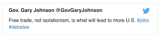 同一時(shí)間,新墨西哥州長(zhǎng)Gary Johnson以及民主黨選民Gary Johnson對(duì)此作出反應(yīng),認(rèn)為自由貿(mào)易不應(yīng)該是孤立主義。
