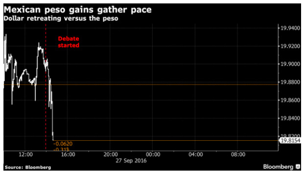 辯論期間,被認(rèn)為辯論表現(xiàn)指標(biāo)的墨西哥比索匯率,有所上漲,期間漲幅一度達(dá)到1.4%,這表明市場(chǎng)人士認(rèn)為希拉里暫時(shí)處于領(lǐng)先趨勢(shì)。