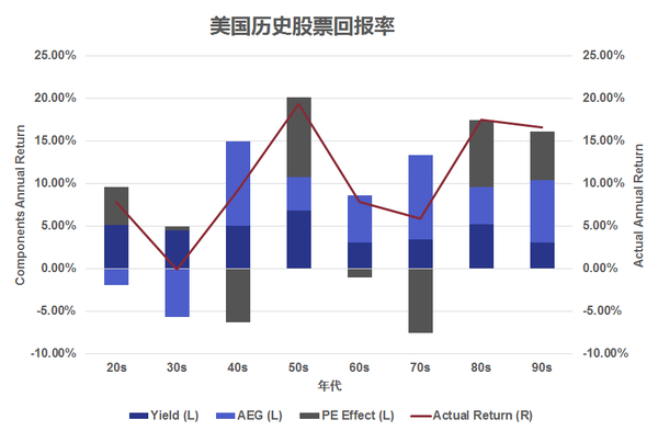 大致來講,我們可以把股市回報分為兩大類:基本面和投機面?;久媸侵腹善弊陨斫o予投資者的回報,主要包括公司分紅和盈利增長。而投機面則主要反映了大眾對于市場的悲觀或者樂觀情緒。從比較長的時間維度來看,基本面給予投資者的回報是可以預測并且比較穩(wěn)定的,而投機面則變化無常,經常在天堂和地獄之間游走。