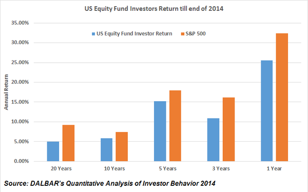 在1995年至2014年的20多年間,股票型基金的投資者在美國每年的平均回報率是5%,而標普500在同一期間每年回報9.22%。債券型基金的投資者平均每年獲得了0.71%的回報,而同期年通脹率為2.37%,全球債券指數的回報則達到了每年5.74%。不管是股票還是債券基金投資者,其回報都遠遜于呆而不動的傻瓜型投資策略。
