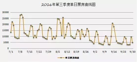 而這種只剩下基礎(chǔ)觀眾和隨機(jī)觀眾消費(fèi)的情況在2016年第三季度單日票房曲線圖中,表現(xiàn)的更加明顯。如圖所示,整個(gè)第三季度表現(xiàn)出一種周一到周四門可羅雀、五六日只賣三天的局面。