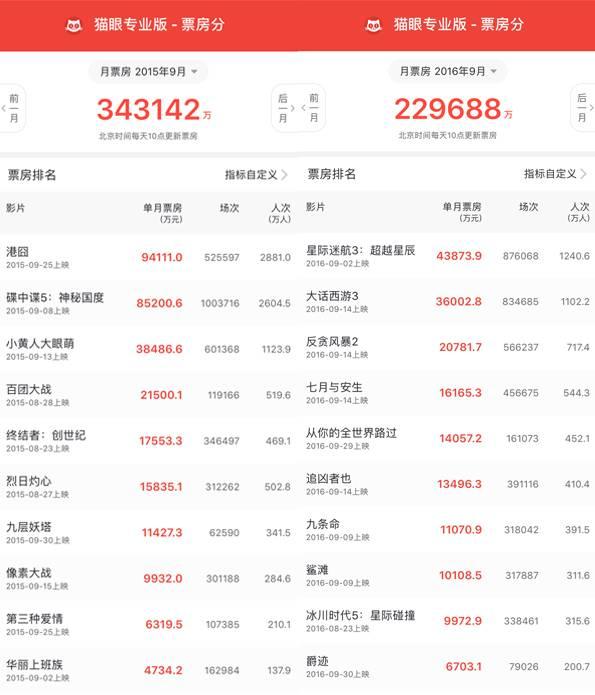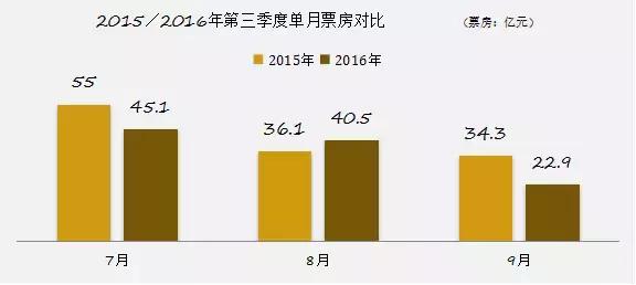一、受市場(chǎng)寒意的影響,國(guó)慶檔影片沒有一部敢和去年的《港囧》一樣提檔一周上映,導(dǎo)致9月下旬有四天單日票房在3000萬線徘徊是同比去年下跌的主要原因;