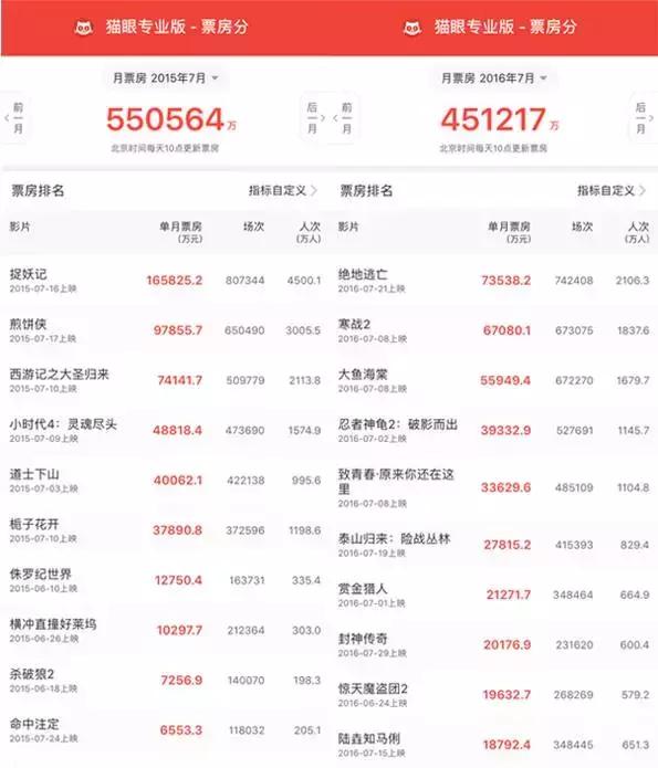 通過近兩年7月同期電影TOP10對(duì)比發(fā)現(xiàn),2016年該月票房下跌源于三個(gè)方面: