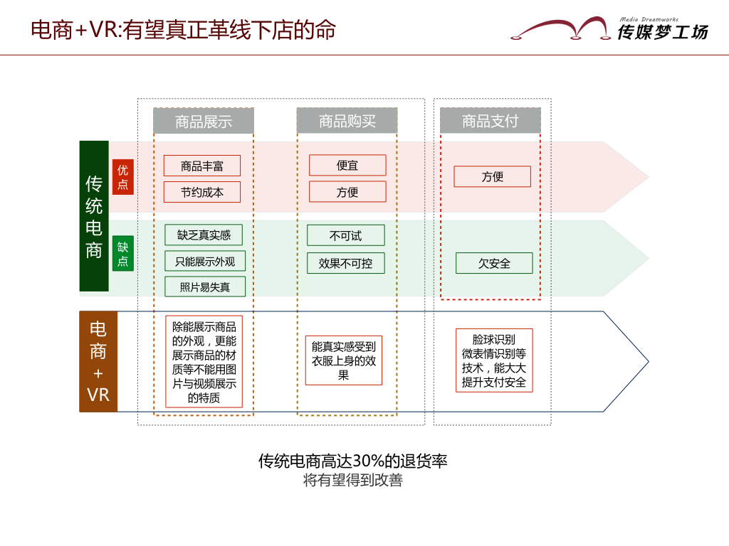 虛擬購(gòu)物,即電商+VR,利用計(jì)算機(jī)生成一種逼真的虛擬環(huán)境,通過各種傳感設(shè)備使用戶沉浸在該環(huán)境中,讓虛擬的網(wǎng)上商品和用戶之間實(shí)現(xiàn)感知交互,讓原本呆板的商品展示變得可觸可碰,傳統(tǒng)電商高達(dá)30%的退貨率將有望得到改善。