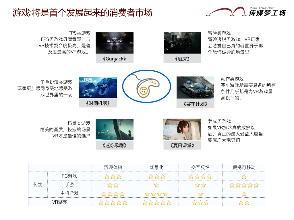 而視頻游戲?qū)⒊蔀槭讉€(gè)發(fā)展的市場(chǎng),而從VR的應(yīng)用場(chǎng)景來看,房地產(chǎn)、電商、教育、醫(yī)療等行業(yè)有可能被改變。