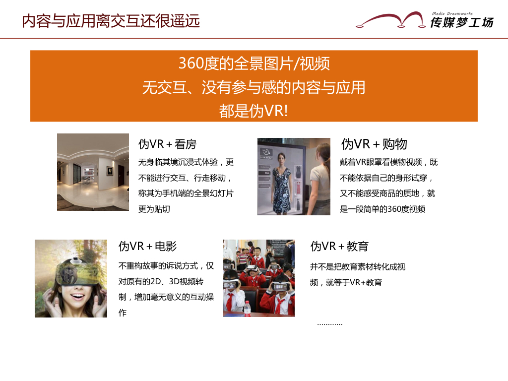 如上面所言的,現(xiàn)階段的VR在電商、房產(chǎn)、教育、電影上的應(yīng)用,有些只是360的全景視頻,有些則還不能有效解決圖像顯示的真實(shí)性問題,有效解決運(yùn)動(dòng)眩暈問題,離真正的VR技術(shù)還相差甚遠(yuǎn)。