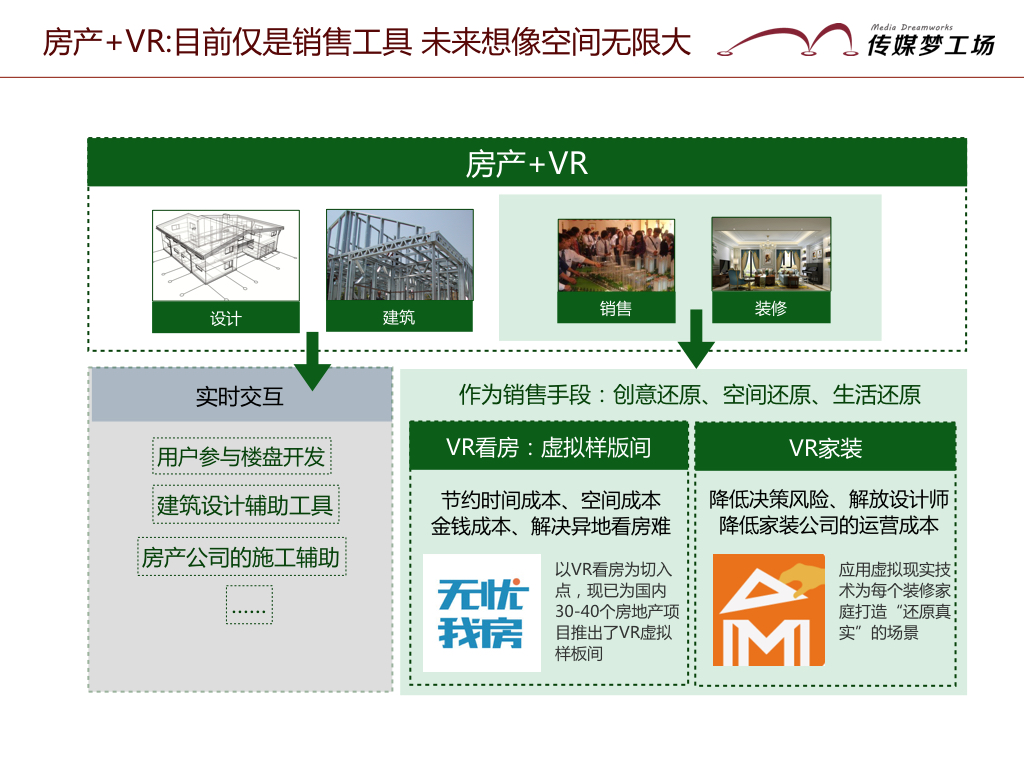VR+地產(chǎn),有助于開發(fā)商與購(gòu)房者之間對(duì)于樓盤、戶型的信息更好的溝通。它想有望影響到房屋設(shè)計(jì)、建造、銷售、裝修每個(gè)環(huán)節(jié)。而目前VR作為銷售的輔助手段,主要切入了房產(chǎn)銷售、家裝軟裝兩個(gè)領(lǐng)域。