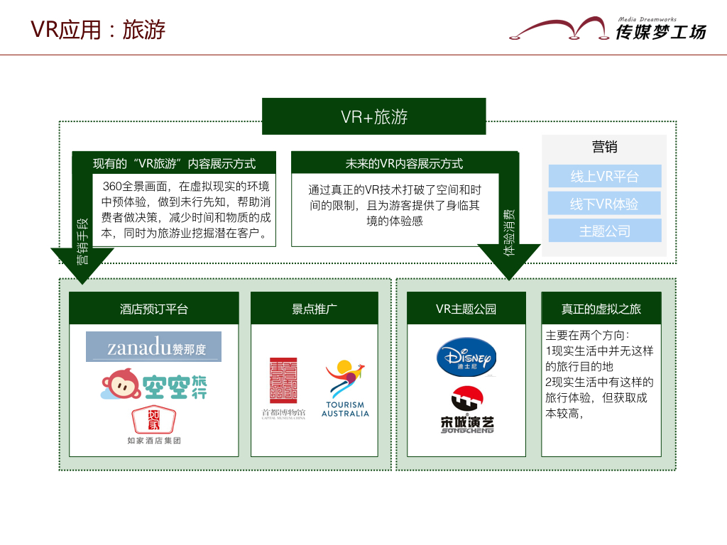 目前VR技術(shù)在旅游業(yè)的應(yīng)用,主要通過360全景畫面,在虛擬現(xiàn)實(shí)的環(huán)境中預(yù)體驗(yàn),做到未行先知,幫助消費(fèi)者做決策,減少時(shí)間和物質(zhì)的成本。主要作為銷售輔助手段,主要應(yīng)用于酒店預(yù)定與景點(diǎn)的推廣。