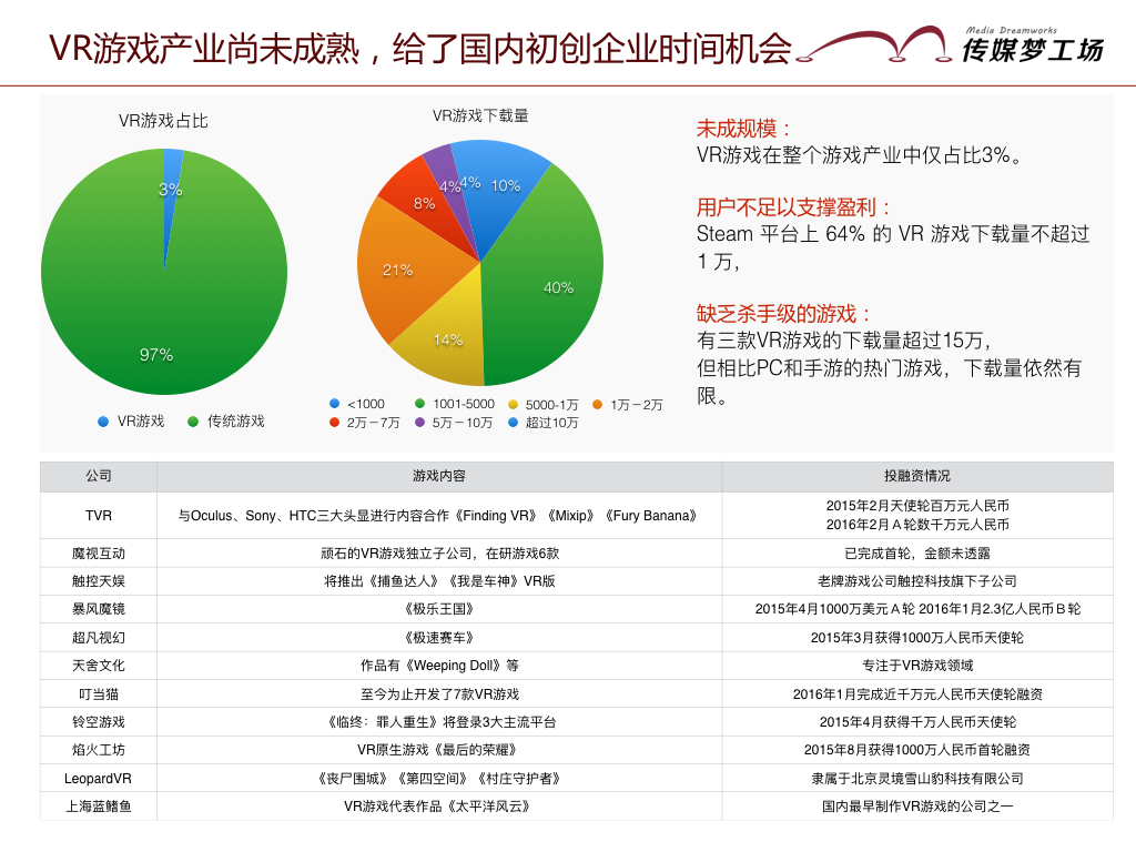 用戶可能尚不足以支撐VR游戲贏利Steam平臺(tái)上64%的VR游戲下載量不超過1萬,超過10萬下載的希望渺茫。就目前的下載量而言,也就是說,VR游戲開發(fā)者應(yīng)該嚴(yán)格控制開發(fā)成本:投入少于10萬美金才有望收回成本,投入超過100萬美金收回成本的希望渺茫。簡(jiǎn)而言之,目前大部分的游戲無法實(shí)現(xiàn)贏利。