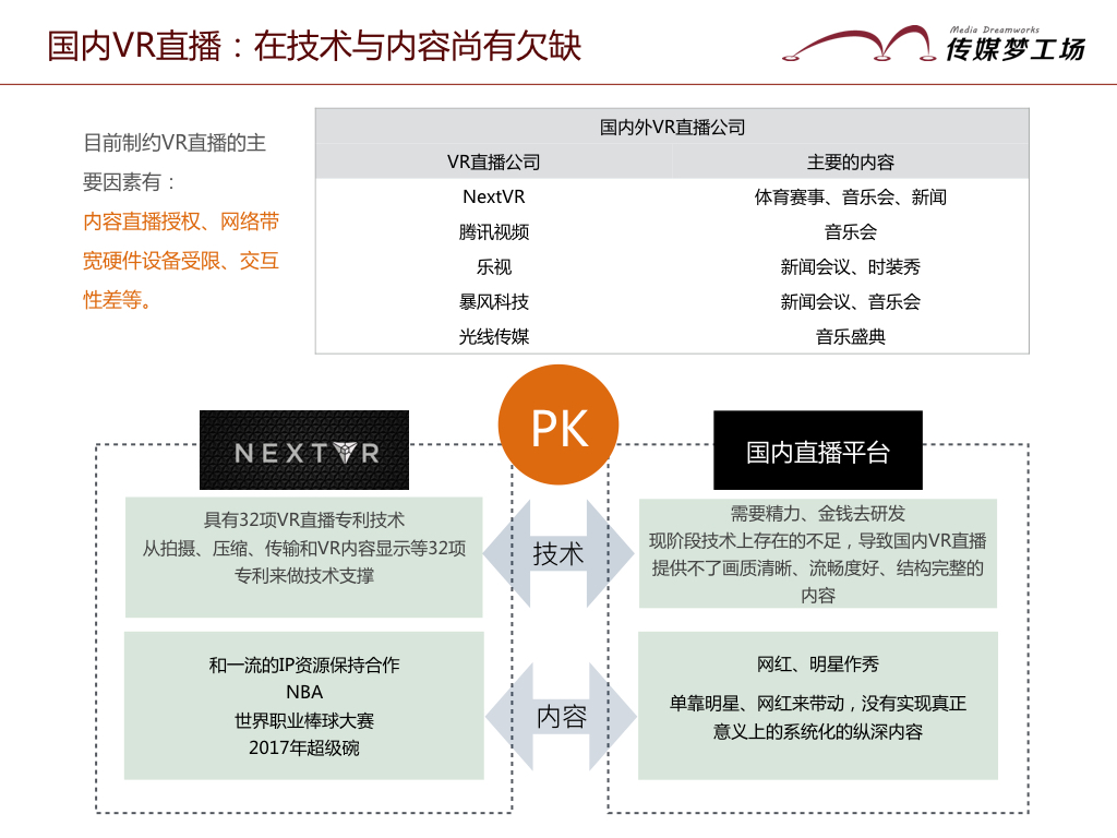 技術(shù)上:NextVR,從拍攝、壓縮、傳輸和VR內(nèi)容顯示等32項(xiàng)VR直播專利技術(shù)來做技術(shù)支撐;國(guó)內(nèi)的VR直播,由于現(xiàn)階段技術(shù)上存在的不足,導(dǎo)致國(guó)內(nèi)VR直播提供不了畫質(zhì)清晰、流暢度好、結(jié)構(gòu)完整的內(nèi)容。