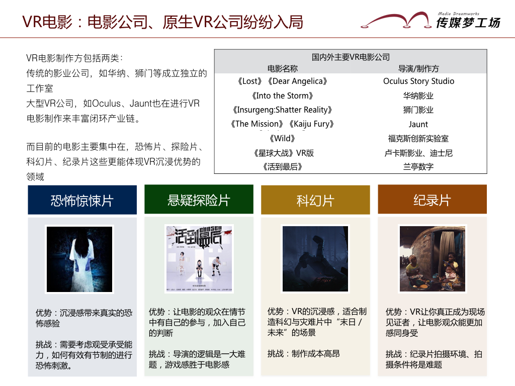 目前電影制作方主要包括兩類:傳統(tǒng)的影業(yè)公司,如華納、獅門等成立獨(dú)立的工作室,另一類則是原生的VR公司,如Oculus、Jaunt也在進(jìn)行VR電影制作來豐富閉環(huán)VR產(chǎn)業(yè)鏈。而目前電影主要集中在,恐怖片、探險(xiǎn)片、科幻片、紀(jì)錄片這些更能體現(xiàn)VR沉浸優(yōu)勢(shì)的領(lǐng)域。