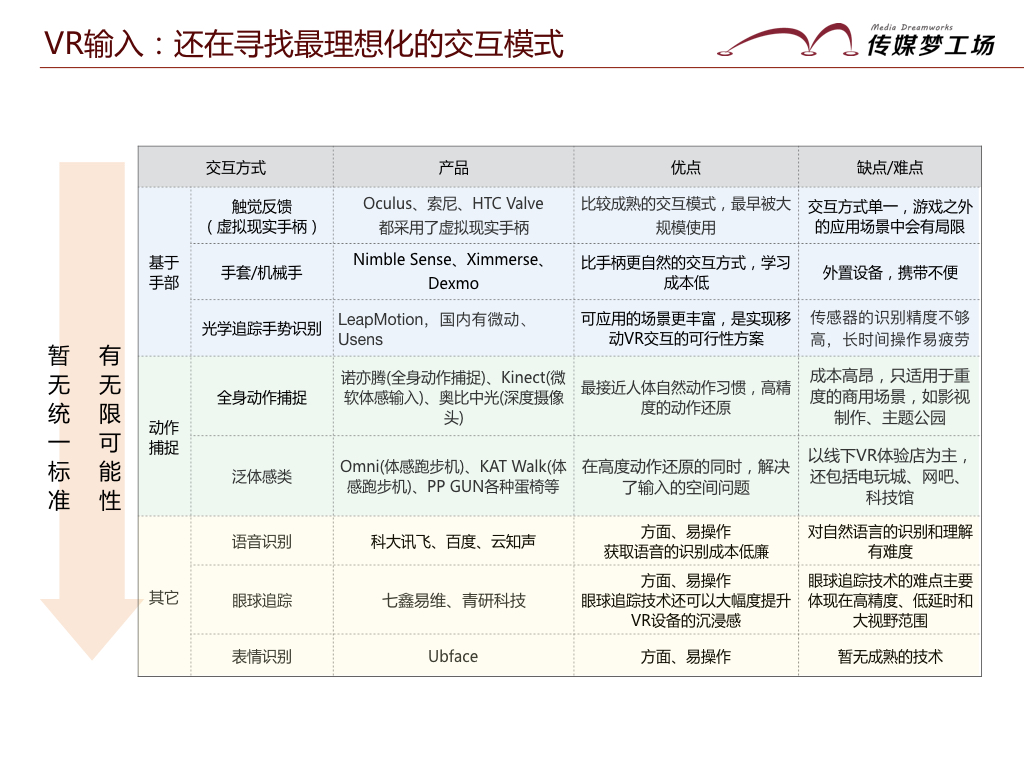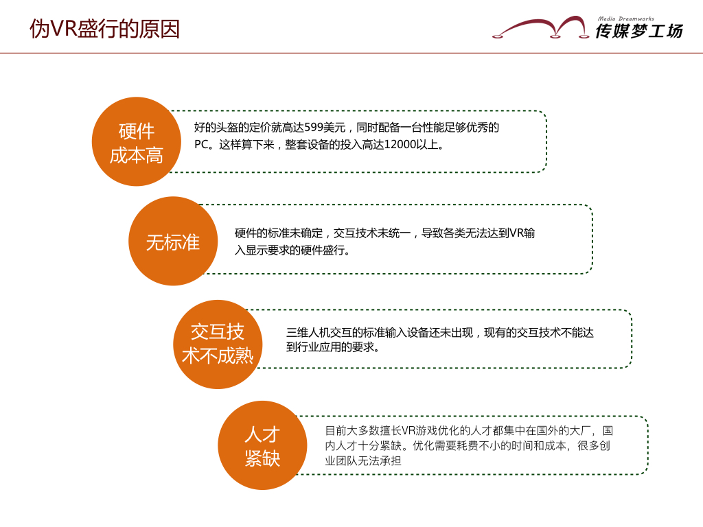 而這些“偽VR”盛行的原因,除了一部分企業(yè)追逐資本風(fēng)口,強(qiáng)行塞入VR概念外,主要是因?yàn)橛布杀靖?,?biāo)準(zhǔn)未統(tǒng)一,交互技術(shù)不成熟、人才緊缺等原因,制約了VR行業(yè)的整體發(fā)展。