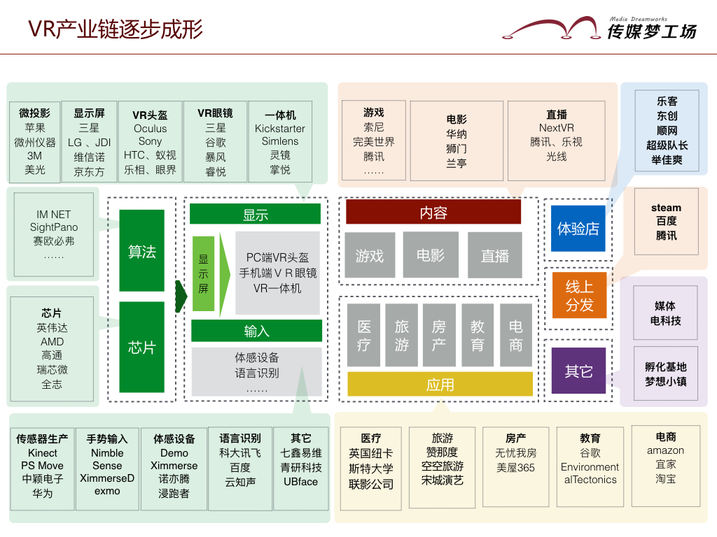 目前,整個(gè)VR產(chǎn)業(yè)鏈已經(jīng)初具規(guī)模。從上圖可以看出,已經(jīng)有不少公司開始從事硬件、內(nèi)容、應(yīng)用和軟件等方面的研發(fā)。