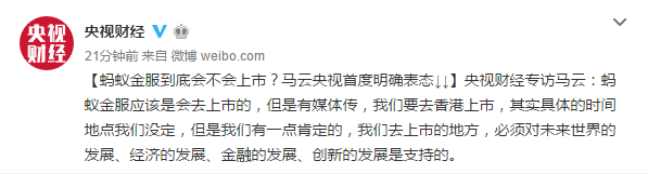 據(jù)央視財經(jīng)微博:馬云在接受采訪時表示,螞蟻金服應(yīng)該是會去上市的,但是有媒體傳,我們要去香港上市,其實具體的時間地點我們沒定。但是我們有一點肯定的,我們?nèi)ド鲜械牡胤?,必須對未來世界的發(fā)展、經(jīng)濟的發(fā)展、金融的發(fā)展、創(chuàng)新的發(fā)展是支持的。