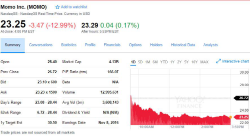 陌陌發(fā)布第三季度財(cái)報(bào)當(dāng)天,股價(jià)一路下滑近13%,跌破其50日均線