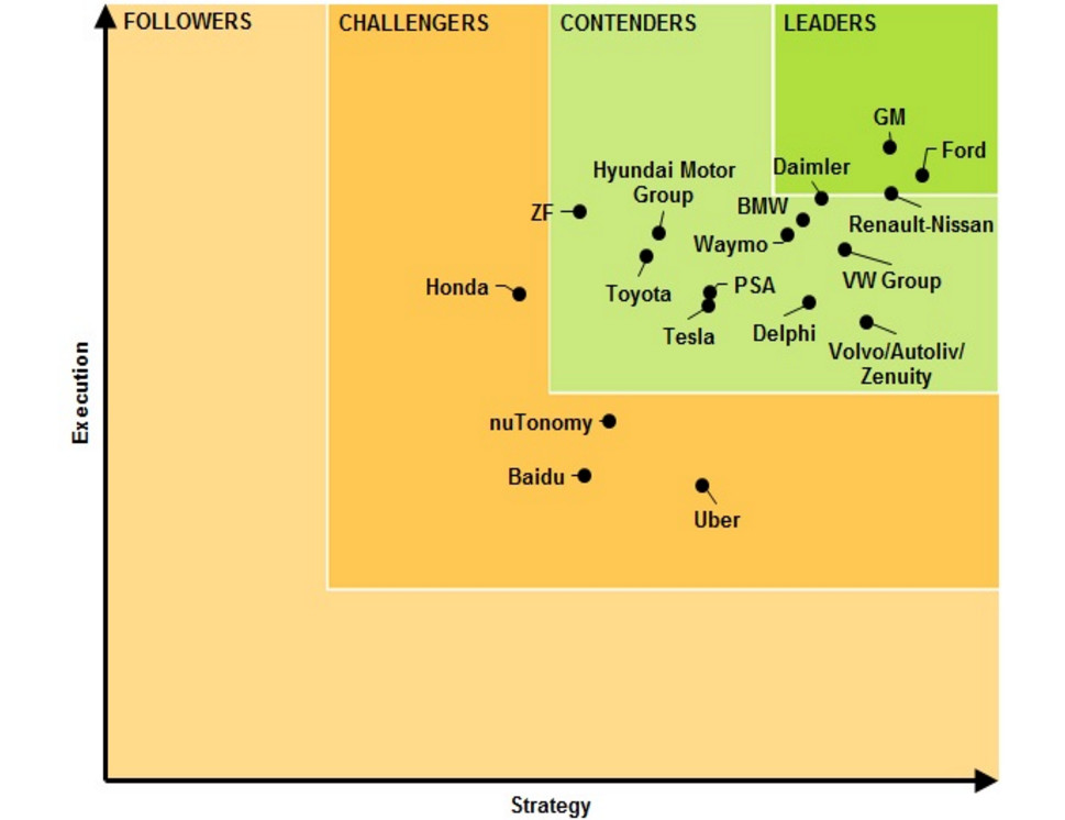 被歸到第二梯隊(duì)的有戴姆勒-梅賽德斯-奔馳、大眾、寶馬、谷歌Waymo、沃爾沃/Autoliv/Zenuity、德?tīng)柛!F(xiàn)代、標(biāo)致雪鐵龍、特斯拉、豐田、采埃孚。