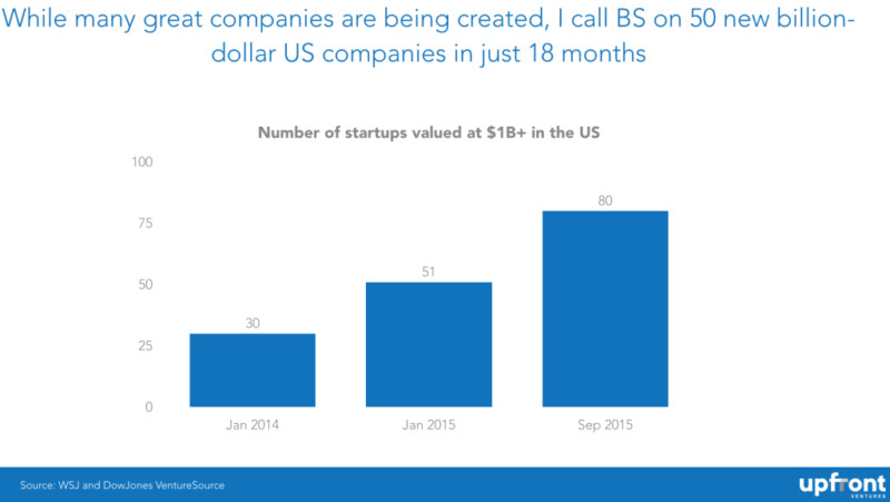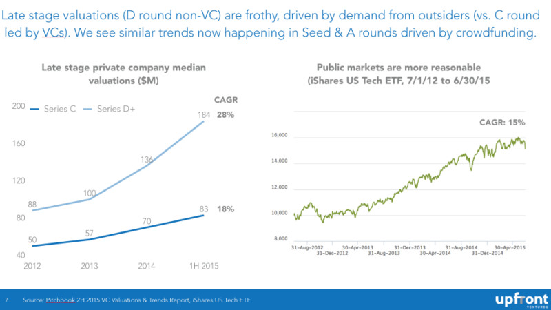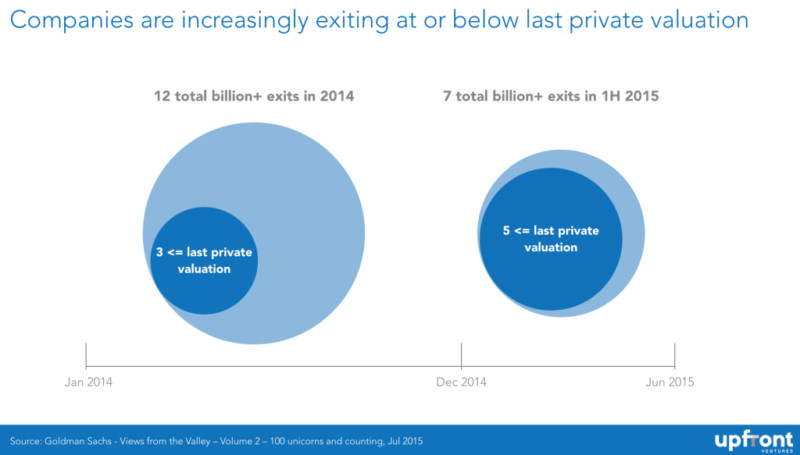 通常而言,市場(chǎng)總會(huì)帶來(lái)一些提示。2014 年,12 次估值中就有 3 次比上一輪估值要低。25% 的 down round(后一輪估值比上一輪低的融資輪次)比例著實(shí)可悲??墒堑搅?2015 年,down round 的比例高達(dá) 71%,7 次估值中就有 5 次比上一輪估值要低。