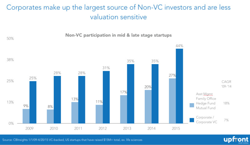當(dāng)你開始深挖次級(jí)獨(dú)角獸俱樂部成員猛增的幕后推手時(shí),就能發(fā)現(xiàn)這些推波助瀾資本的一些來(lái)源。資本來(lái)源之一就是來(lái)自企業(yè)投資者,包括谷歌、樂天(日本最大的網(wǎng)絡(luò)零售商)、阿里巴巴、康卡斯特等。這些企業(yè)投資者增加了風(fēng)險(xiǎn)投資的比例,但在利潤(rùn)動(dòng)機(jī)上與傳統(tǒng)投資者有顯著不同,企業(yè)投資者的風(fēng)投行為往往是出于定價(jià)動(dòng)機(jī)。這并非是與企業(yè)投資者劃清界限,筆者只是強(qiáng)調(diào)出于戰(zhàn)略投資的考慮,企業(yè)投資者的投資行為往往會(huì)超出純粹的金融投資者的理解范圍。