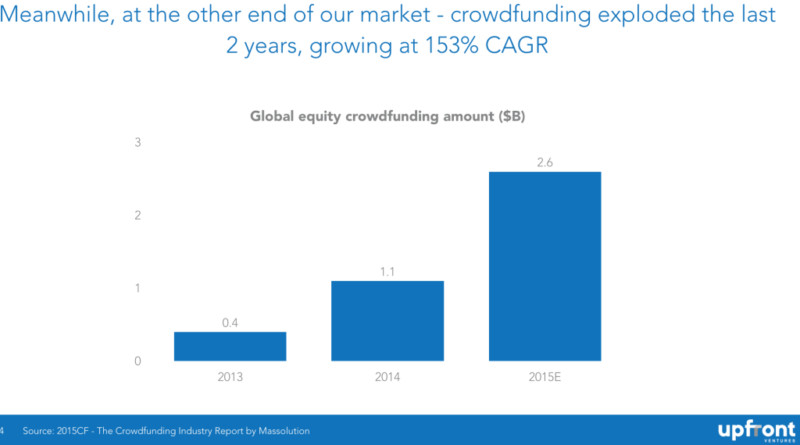 如果不承認(rèn)眾籌在創(chuàng)業(yè)公司中所扮演的重要角色,那就無(wú)法準(zhǔn)確地討論 2016 年風(fēng)險(xiǎn)投資行業(yè)的愿景及展望。在過(guò)往的兩年中,我們看到有大量的科技創(chuàng)業(yè)公司通過(guò)眾籌平臺(tái)獲得資金。同樣在過(guò)往的兩年中,眾多新興眾籌平臺(tái)如雨后春筍般在全球各地涌現(xiàn),眾籌的金額也水漲船高,從兩年前的 4 億美元暴漲至 26 億美元。